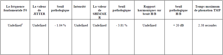 résultats de l’analyse acoustique de la voix du troisième cas (B.S), avant l’application du protocole thérapeutique