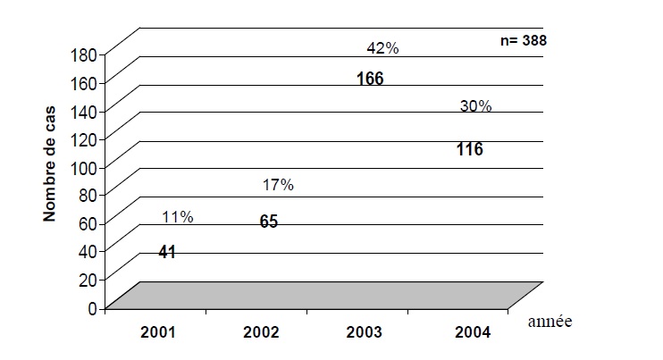 La distribution des envenimations selon les années montre une augmentation de l’incidence entre 2001 et 2003, puis une diminution en 2004(figure 1). Cette augmentation peut être expliquée par une meilleure sensibilisation de la population alors que cette diminution par une meilleure connaissance du problème.