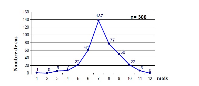 Les résultats révèlent que les envenimations sont plus fréquentes entre mai et octobre avec un pic au mois de juillet comme le montre la figure2. Cette période correspond aux fortes chaleurs où les scorpions sont actifs ; Ainsi nos donnés rejoignent celles de la littérature (Abroug et al.1996, Moulki et al. 1997, Touloun et al. 2001, Soulaymani et al. 2002 ; 2004 ; 2005).