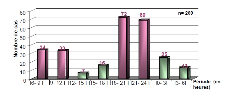 La majorité des patients envenimés ont été piqués la nuit (66.5%) et plus de la moitié (52.4%) entre 18 et 24 heures (figure 3) En effet, Les piqûres et envenimations scorpioniques ont lieu principalement en fin de journée et durant la première partie de la nuit car, le scorpion, animal à activité nocturne quitte son gîte à la tombé de la nuit pour s’abreuver et se nourrir. (Champetier 1985, Gaudreault 2000, Goyffon et al.1982, Gueron et al. 1992, Nouira et al.)