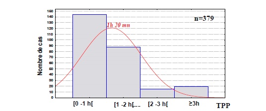 La moyenne du TPP est de 1heure 20 minutes, et 54% seulement des envenimés arrivent avant 1 heure (TPP< 1h) au centre de santé. Les patients arrivés à la structure sanitaire dans un délai inférieur à 1 heure évoluent mieux que ceux qui arrivent tardivement. Et tous les auteurs s’accordent sur le fait que le temps post piqûre est un facteurs décisif dans la prise en charge. (Jeddi et al. 1988, Goyffon 2002, Soulaymani 2002 ; 2004 ; 2005).