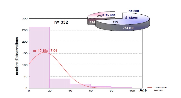 La distribution des envenimés en fonction de l’âge des patients (figure 5) montre un maximum chez les jeunes enfants avec moyenne d’âge de 15.19 ± 17.04 ans. De plus la distribution par tranche d’âge a montré que 72% des envenimés ont un âge inférieur ou égal à 15 ans, soit à peu près le trois quart des envenimés. Ainsi, nos données rejoignent ceux de la littérature (Bouaziz et al. 1996, Abroug et al. 1999, Nouira et al. 1999 ; Possani 2000).