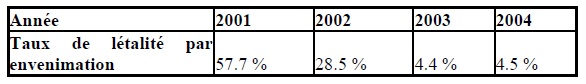 L’évolution des patients envenimés tend à être favorable d’une année à l’autre. La figure 6 montre une importante diminution des décès entre 2001 et 2003, puis une stabilisation en 2004.