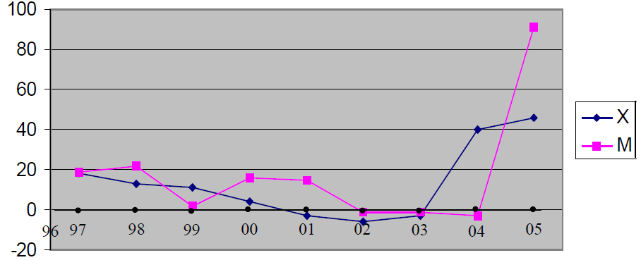 - le taux de croissance des importations évolue en dents de scie de 1997 à
