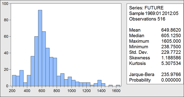 En moyenne le prix anticipé du soja sur le marché à terme de 1969 à 2011 tourne autour de 649,862, le prix max est de 1605 et le prix min 238,75 soit une différence de 500%. La statistique de Jarque-Bera est largement supérieure à 5,99 pour dire que les prix « future » ne suivent une loi normale. En effet d’une part, il y a une occurrence faible de prix 1600, 1400, 1200,1000 qui s’écartent trop de la moyenne qui se situe à 649,862 caractérisant une « queue épaisse » et enregistrée par la kurtosis qui dépasse celle de la loi normale.
