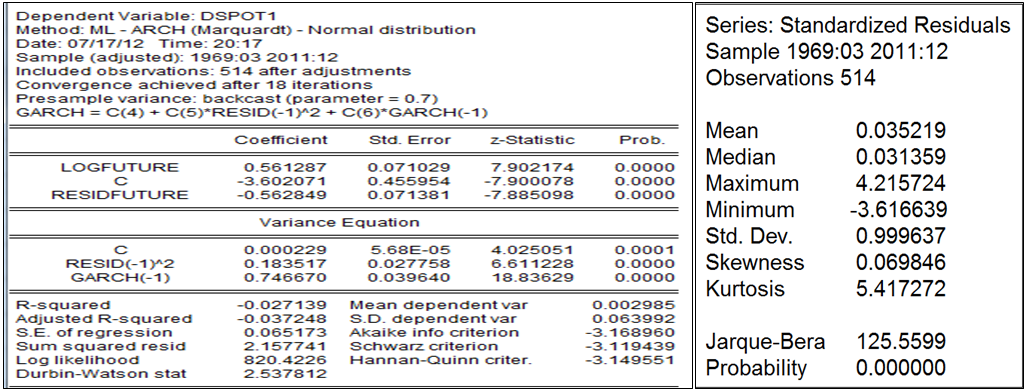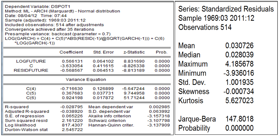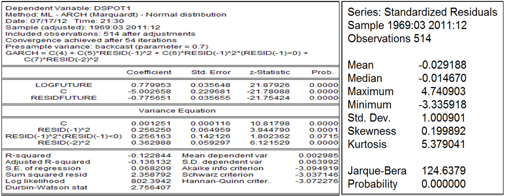 Les tests sur le corrélogramme des écarts et le corrélogramme des de ces mêmes écarts au carré montrent la présence d’auto-corrélation et d’hétéroscédasticité. Dans le cadre d’une couverture par la détermination du nombre de contrats que le producteur doit acheter, nous nous intéressons particulièrement au garch et les modèles non linéaires egarch ,tarch et tgarch.