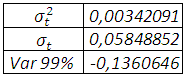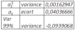 La couverture par un garch estime un taux de couverture de 56,1287%, taux auquel on peut se fier au regard des résidus non corrélés et hétéroscédastiques malgré l’épaisseur de la queue de distribution. Par la même occasion nous calculons la value at risk au seuil de 1%.