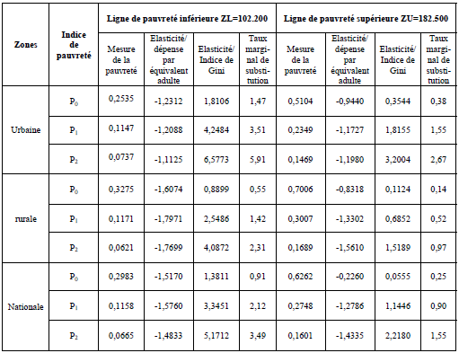 Les tableaux 6 et 7 ci-dessous présentent les élasticités des indices FGT par rapport à la moyenne des dépenses et à l’indice de Gini, ainsi que les taux marginaux proportionnels de substitution, suivant les lignes de pauvreté retenues et les zones de résidence.