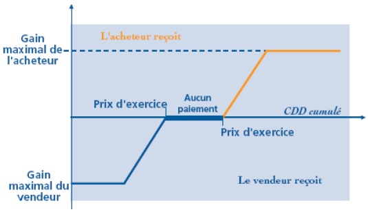 – Le Cap, il s’agit « d’un plafond, cela permet à l’acheteur de pouvoir, moyennant le paiement d’une prime, plafonner ses pertes qui sont causées par des conditions climatiques adverses »(115). Ainsi, une compagnie aérienne peut acheter ce produit, qui sera basé sur le nombre de jour d’enneigement important, dans le but de compenser sa perte de revenus du fait de l’immobilisation sur le sol des ses appareils aériens.
