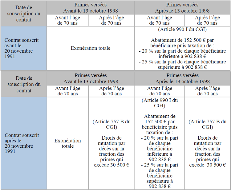 – Pour les contrats souscrits avant le 20 novembre 1991, la fiscalité en cas de dénouement du contrat par décès est la suivante :