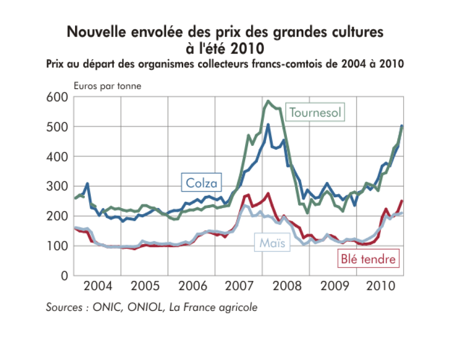 De 2006 à 2008, la flambée des cours agricoles(38) a eu des effets néfastes pour les consommateurs, provoquant même des « émeutes de la faim » dans certains pays d’Afrique, et aussi pour certains professionnels de l’agriculture. En 2009, les prix des céréales ont chuté mais subissent une forte augmentation depuis 2010. La hausse actuelle des prix s’explique par une sécheresse aux Etats-Unis qui compromet les récoltes de maïs. Le cours du blé a également explosé en raison d’une sécheresse ayant sévie en Ukraine et en Russie. Ces pays exportateurs de céréales pèsent sur le marché. La diminution de la production mondiale ne peut qu’induire un accroissement des prix. En France, cette situation se traduit par la hausse du cours du blé de 28% depuis le mois de juin 2012.