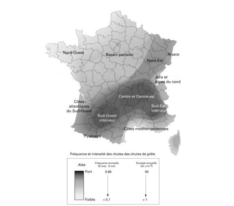 L’aléa climatique est, parmi les nombreux risques agricoles, le plus difficilement maîtrisable et prévisible compte tenu de l’instabilité des conditions météorologiques. Ce risque menace de destruction le produit cultivé tout au long de son développement c’est-à-dire de sa plantation jusqu’à la récolte. De nombreux évènements climatiques peuvent survenir comme la grêle, le gel, la tempête, la sécheresse ou l’inondation. Ces risques sont répartis différemment sur le territoire français. Ainsi, une culture située à l’ouest de la France sera plus exposée à la sécheresse tandis qu’un agriculteur rhônalpin a plus de risques de subir un orage de grêle à la fin du printemps.