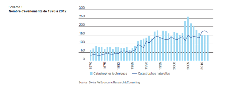 Si, de manière statistique, les tremblements de terre restent statistiquement atones, les événements naturels tels que les cyclones, tempêtes et ouragans se sont multipliés entre 1970 et 2013, ces derniers semblent plus que jamais difficilement prévisibles. La FFSA(26)indique qu’il « serait tout aussi imprudent de projeter l’évolution des aléas naturels sur les seules références du passé. Une rupture de tendance est plus que probable dans les prochaines années, même s’il est difficile d’en apprécier l’amplitude et l’échéance précise. »