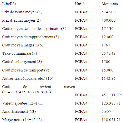 Ainsi donc, la commercialisation a fourni une marge nette positive de 118.031,71FCFA/tonne par grossiste. De même, elle crée de la valeur ajoutée pour la communauté, occupe et rémunère une partie de la population : des autres acteurs de la commercialisation (collecteurs, coutiers) jusqu’aux ouvriers saisonniers (chargeurs, couturiers, transporteurs, etc.).