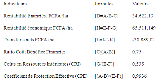 La dernière ligne de la MAP, indique que la production dispose d’un CPE égal à 0,9936. Le Coefficient de Protection Effective étant inférieur à 1 alors les producteurs sont taxés et ils ne bénéficient d’aucune incitation à produire. De même, le système de production présente un transfert net négatif. Ainsi donc, les producteurs sont défavorisés et subissent une taxe implicite de 30.889,02FCFA/ha.