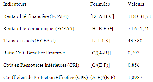 Paragraphe 1 : Mesure de la rentabilité financière, de la rentabilité économique et des transferts de la fonction de production de la filière anacarde