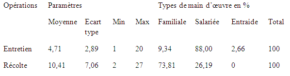 Le tableau n°14 révèle que l’opération d’entretien nécessite en moyenne 4,71 (+/- 2,89) ouvriers agricoles. Tandis que l’activité de récolte utilise en moyenne 10,41 (+/- 7,06) ouvriers agricoles. Ces moyennes sont composées de la main d’œuvre familiale, de la main d’œuvre salariée et de l’entraide. Les deux premières étant les plus dominantes et l’entraide très peu observée. Cependant, il est de constat dans la commune de Savalou que l’opération d’entretien est menée principalement par la main d’œuvre masculine contrairement à celle de la récolte qui mobilise en grande partie la main d’œuvre féminine et juvénile.