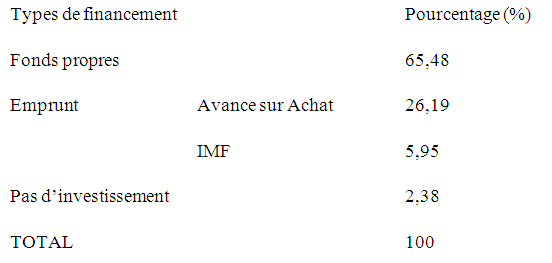 Dans la commune de Savalou, la principale source de financement des opérations de production de l’anacarde reste le financement sur fonds propres. En effet, les résultats de l’enquête de terrain présentés dans le tableau n°16 indiquent que 65, 48% des producteurs financent eux-mêmes les activités de production. Aussi, seulement 5,95% des producteurs ont fait recourt aux institutions de micro finance (CLCAM et PROMIC) pour les mêmes opérations. Cependant, 2,38% des producteurs ont décidé involontairement ou volontairement selon les contraintes (manque de financement ou faible rendement) de ne pas investir dans leur champ d’anacardiers.