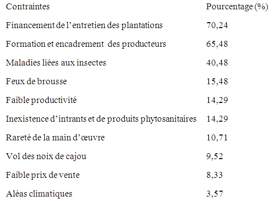 Les producteurs d’anacarde de la commune de Savalou font face à certaines contraintes impactant la production. Elles sont résumées dans le tableau n°16.