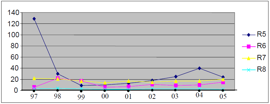 est instable. Les courbes R5 ; R6 ; R7 ont un trend haussier de 2000 à 2005. Ceci fait