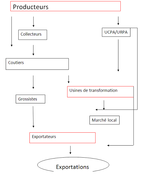 1. Un circuit de vente court où les producteurs vendent leur production aux groupements de producteurs (UCPA et URPA) qui le revendent aux exportateurs.