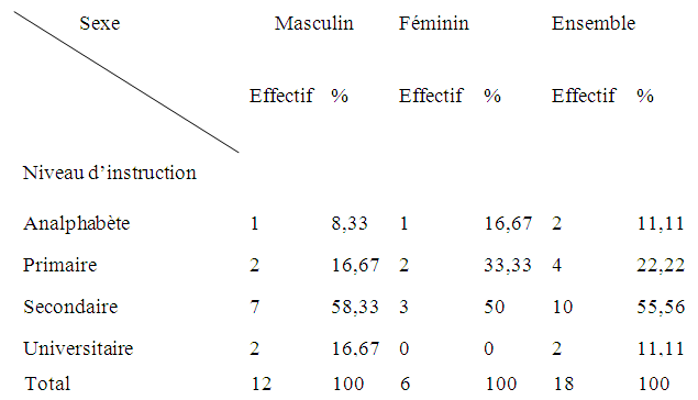 Tableau n°8 : Répartition des enquêtés selon leur niveau d’instruction et leur sexe