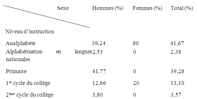 Au total, le taux d’instruction dans la zone d’étude est fort (58,33%) mais reste décroissant chez les hommes du cours primaire au 2nd cycle du cours secondaire et chez les femmes, continu du cours primaire au 1er cycle du cours secondaire. De plus chez les hommes enquêtés, personne n’a le BAC et chez les femmes personne n’a le BEPC.