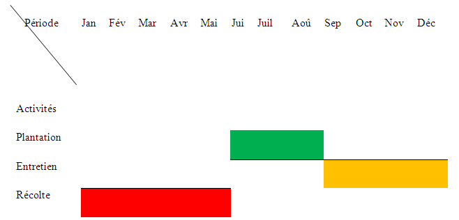 En effet, les opérations d’entretien qui se déroulent de septembre à Décembre, sont : le fauchage, le sarclage, le regarnissage, l’élagage, la coupe d’éclaircie, le nettoyage, la fumure et le traitement phytosanitaire. Quant à la récolte, elle se déroule de janvier à Mai en même temps que la campagne de commercialisation qui se passe de Mars à Juin.