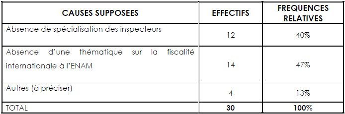 En tenant compte du seuil de décision fixé, nous déduisons de ces résultats que la cause de la non maîtrise du concept des paradis fiscaux est l’absence d’une thématique sur la fiscalité internationale à l’ENAM. Cependant, en considérant les poids des autres causes qui ne sont pas négligeables, nous les admettons aussi comme des causes réelles mais subsidiaires. En conséquence, l’hypothèse n°1 de l’étude n’est que partiellement vérifiée, car, en dehors de l’absence d’une thématique sur la fiscalité internationale à l’ENAM, d’autres raisons expliquent ce problème.