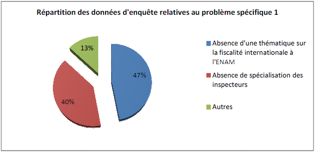 ‐ 40% rattachent ce problème à l’absence de spécialisation des inspecteurs ; et 13% évoquent diverses autres fait que la fiscalité béninoise ne prenne façon exhaustive les normes fiscales qui régissent les affaires économiques internationales.