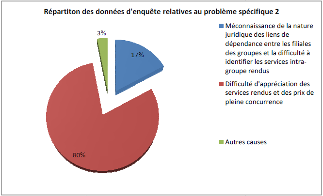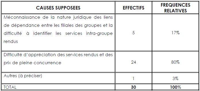 Il résulte de l’analyse des données que parmi les personnes interrogées, 80% estiment que la non maîtrise des techniques des prix de transfert utilisées par les filiales des multinationales provient de la difficulté d’appréciation des services rendus et des prix de pleine concurrence. 17% estiment que c’est à cause de la méconnaissance par les inspecteurs de la nature juridique des liens de dépendance entre les filiales des groupes et la difficulté à identifier les services intra-groupe rendus. Les 3% restants de l’échantillon évoquent d’autres causes, notamment l’absence d’information et de formation des inspecteurs aux techniques des prix de transfert.