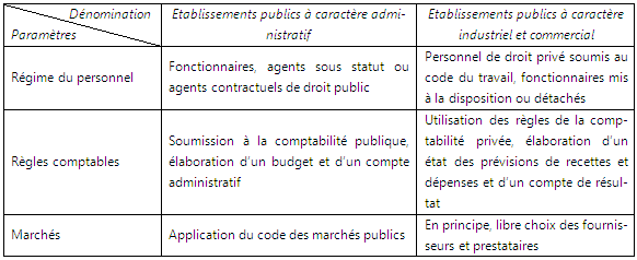 Globalement, les établissements publics à caractère administratif sont soumis exclusivement au droit public, tandis que les établissements publics à caractère industriel et commercial sont en grande partie régis par le droit privé. Cette distinction entraîne les conséquences suivantes :