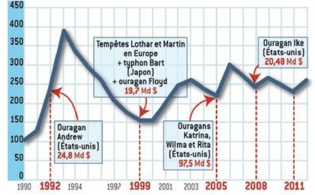 Enfin, l’augmentation du niveau de vie, permet à une partie de la population d’acquérir de plus en plus de biens ou de construire des résidences secondaires dans des régions exposées au risque, comme sur la côte Atlantique. Par conséquent, la réalisation d’un risque climatique impacte les assureurs de manière importante. Ils doivent régler des indemnités dont la facture totale s’élève parfois à des milliards de dollars. Par exemple, l’ouragan Andrew qui a touché les Etats-Unis, en 1992, a coûté plus de 32 milliards dont près de 17 milliards de dollars a été supportés par les assureurs. En Europe, la tempête Emma, qui a balayé le Nord-est de l’Europe en 2008, a couté aux assureurs 1milliard euros. En tout depuis les années 1980, les aléas climatiques sévères ont couté environ, 1600 milliards de dollars de dégâts dans le monde, dont 22 milliards de dollars pour les assureurs(65).