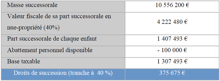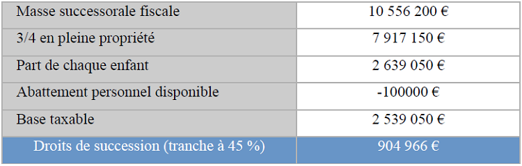 La part de chaque enfant est ainsi évaluée à (18 000 000 € x 40 %)/3 = 2 400 000 €