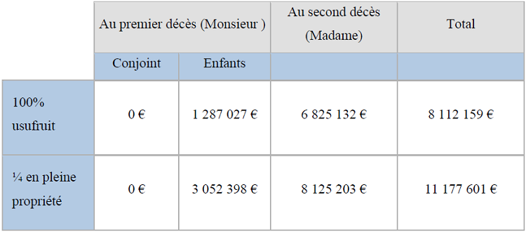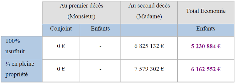 Economie réalisée avec un investissement complémentaire d’1 000 000 € en assurance vie et le démembrement de la clause bénéficiaire de ce contrat ainsi que du contrat existant et valorisé à 17 000 000 € :