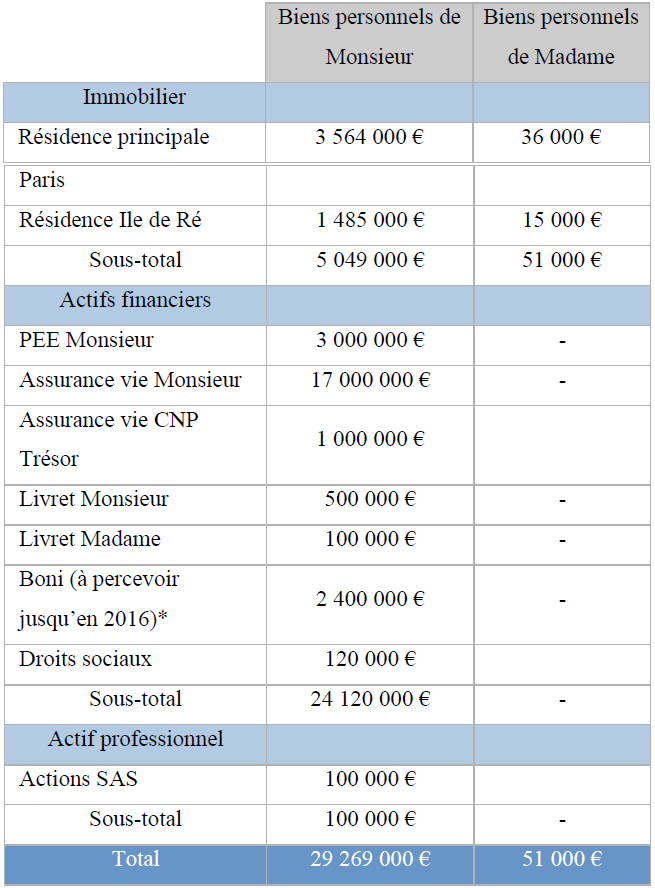 Dans l’hypothèse du décès de Monsieur, ses héritiers se partageront en conséquence une masse successorale valorisée à 10 556 200 € selon leur part respective dans la succession.