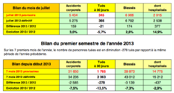 Les dernières statistiques concernant le mois de juillet confirment la tendance de la baisse de la mortalité routière(10). Celle-ci a diminué de 5,7 % ce mois de juillet en comparaison à ce même mois de l’année dernière. Il s’agit de la plus forte baisse enregistrée en juillet depuis l’apparition des premières statistiques en 1948. Cependant, malgré ces bons chiffres, l’accidentalité est quant à elle en hausse. Ce qui signifie que le nombre de blessés a augmenté de 2,6 % par rapport au mois de juillet de l’année 2012, de même que les accidents corporels affichent une hausse de 3 % et le nombre de personnes blessées hospitalisées subit une augmentation de 14,9 %, ce qui correspond à 377 hospitalisations supplémentaires cette année en juillet.
