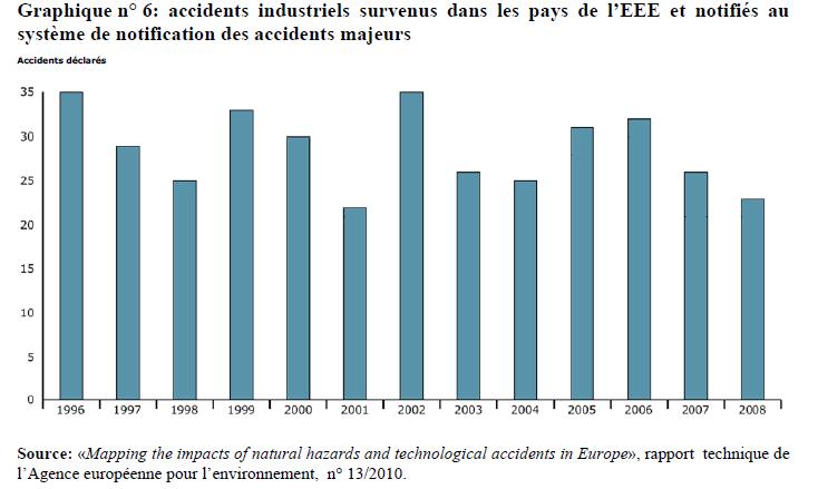 Les impacts économiques de sinistres technologiques catastrophiques sont de l’ordre de 6 milliards assurés en 2011, tout comme en 2012.(42) Il s’avère qu’au sein de l’Espace Economique Européen, le coût des catastrophes technologiques reste plutôt stable depuis 1996, à en juger la tableau suivant :