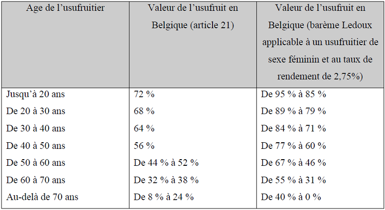 En Belgique lors de l’attribution du bénéfice en usufruit à une personne et la nue-propriété à une autre, chacune d’elles sera redevable des droits de succession afférents à ce qu’elle reçoit sur la fondement d’un pourcentage basé sur l’âge de l’usufruitier.