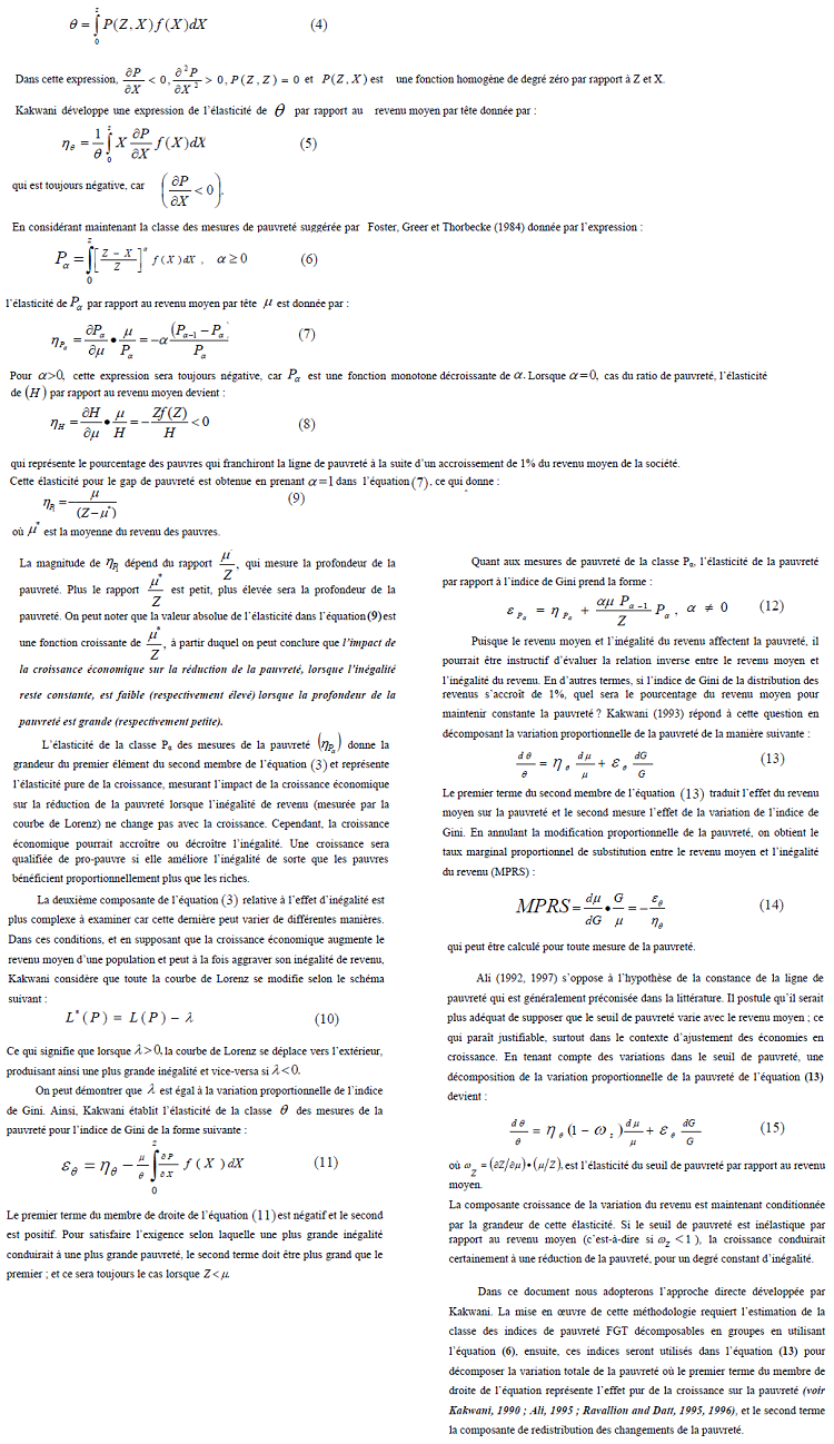 Afin de spécifier les deux effets précédents en prenant en considération un indice de pauvreté, Kakwani suppose, par la suite, que le revenu X d’un individu est une variable aléatoire de fonction de densité f(X) et de fonction de répartition F(X). A partir de la classe des mesures de la pauvreté (possédant des propriétés d’additivité et de séparabilité), dénotée par θ et donnée par :
