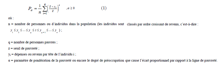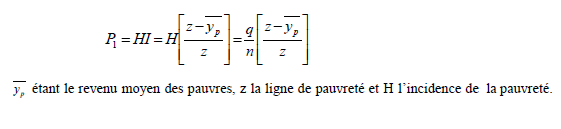 Pour pouvoir élaborer des politiques d’intervention dans le domaine de la réduction de la pauvreté, il est important de savoir non seulement combien il y a de pauvres, mais également quel est leur degré de pauvreté. L’indice d’écart de pauvreté (P1) est utilisé à cette fin, à savoir, mesurer l’incidence mais aussi le degré de la pauvreté. Son expression est donnée par la formule suivante :