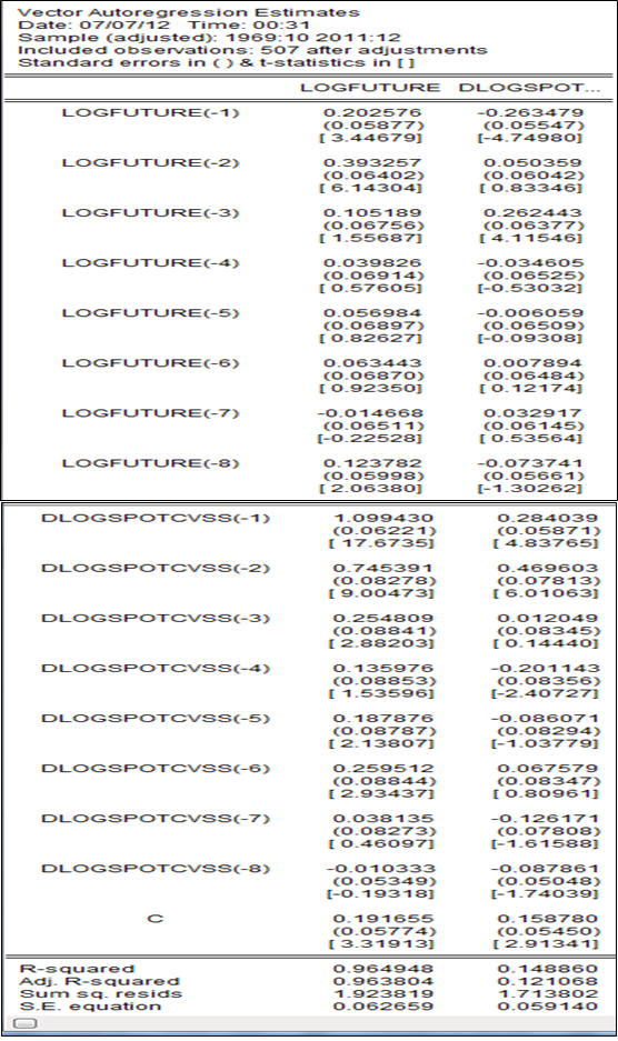 Le test de causalité montre une influence mutuelle entre la variation du prix spot et le prix future, mais l’influence du rendement du prix spot sur le prix future est plus marquée. Mais cela permet-il d’en conclure un effet négligeable de la spéculation sur le prix du soja ? Répondre à cette question c’est choisir en même temps la variable exogène de la relation. Dans le cadre d’une couverture, on ne peut pas négliger l’effet des anticipations sur la variation du prix.