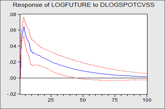 Le prix futur du soja réagit immédiatement à un choc sur la variation du prix au comptant. Cette réaction se traduit, tout en gagnant de l’instantanéité, par une baisse jusqu’à la période 5 suivie d’une hausse jusqu’à la période 7 et d’une baisse jusqu’à la période 9. Jusqu’à la période 100 et même au-delà la réactivité ne se ternie pas.