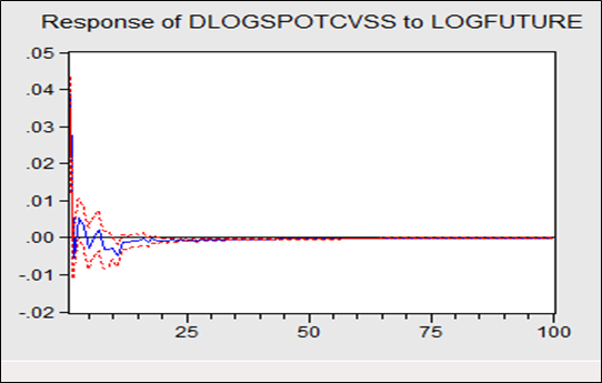 C-3-2- Fonctions de réponses impulsionnelles De la variation du prix au comptant du soja suite à un choc sur les variations des prix future.