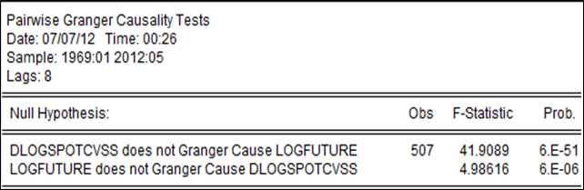 Les analyses uni-variées concluent un marché à terme inefficient et un marché physique efficient caractérisé par une marche au hasard avec dérive à erreur. Autrement dit les prix spot et prix future ne sont pas intégrés au même ordre, ce pourquoi le modèle à correction d’erreur est écarté en faveur de la modélisation vecteur autorégressif. Mais avant cela il faut s’interroger sur le lien de causalité entre les séries stationnaires en l’occurrence dans notre cas le prix anticipé sur le marché à terme et les rendements ou variations mensuelles du prix du soja sur le marché physique.