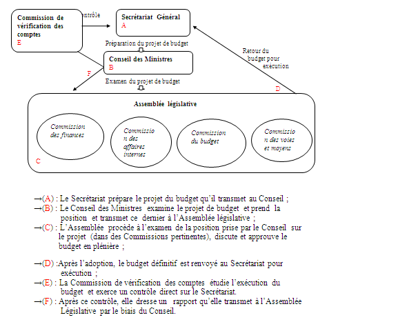 La procédure budgétaire s’inscrit dans le cadre destiné à limiter la croissance de certaines dépenses. En effet, toutes les dépenses de la Communauté doivent être couvertes par le budget et la préparation de ce dernier incombe au Secrétaire Général (144); cela ressort clairement de l’article 132 §2 qui dispose que « … un budget de la Communauté pour chaque année ordinaire est préparé par le secrétaire général, pour examen par le Conseil avant d’être approuvé par l’Assemblée ». A ce niveau, nous voyons que l’Assemblée joue un rôle primordial en matière budgétaire en ce sens qu’aucune dépense sur les recettes de la Communauté ne peut être effectuée sans l’approbation de cette institution. Ainsi, la déclaration des prévisions annuelles des dépenses et recettes de la Communauté est présentée au Bureau du Conseil à une date que la Commission des affaires internes désigne. A ce niveau, le président du Conseil doit dans le budget rendre compte du bilan financier ou relevé des comptes de la déclaration financière et des prévisions de dépenses de la Communauté respectivement à la Commission du budget et celle des prévisions (145).