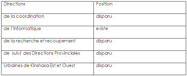 La Direction opérationnelle comprend dans son sein une seule direction. C’est celle de grande entreprise et les directions provinciales et la direction urbaine de Kinshasa comprennent des services extérieurs, qui sont les centres des impôts et les centres d’impôts synthétiques.