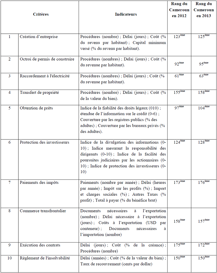 Le classement de la Banque Mondiale repose sur 10 critères visant à déterminer la facilité qu‘ont les investisseurs pour faire des affaires(11) de façon générale. L’indice « Doing Business » de la Banque Mondiale est publié annuellement, et classe les pays en fonction de la qualité du climat des affaires qui y règne. Ce classement concerne 185 pays dont le Cameroun fait partie. Le tableau suivant détaille les 10 critères retenus par la banque mondiale et le rang obtenu par le Cameroun durant les deux dernières années.