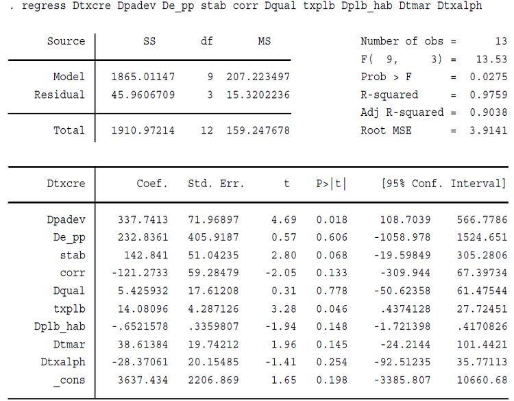 Dans notre cas, la statistique de Fisher calculée par le logiciel STATA 12 est F= 13,53 et la Probabilité associé est inférieure à 5% (0,0275 < 0.05), or la statistique lue dans la table de Fisher à 9 et 3 degrés de liberté au seuil de 5% est de 3,85: donc l’hypothèse nulle est rejetée et le modèle est globalement significatif. Ce résultat est conforme à la valeur de la statistique R2 ajusté (0,9038) qui renseignent aussi sur la qualité du modèle économétrique (R2 tend vers l’unité).