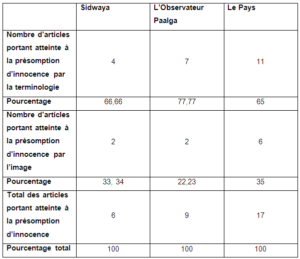 L’étude de tous ces articles met en exergue les différentes formes d’atteintes à la présomption d’innocence même si dans la presse quotidienne burkinabè, la volonté de préserver le principe est aussi visible dans certaines productions.